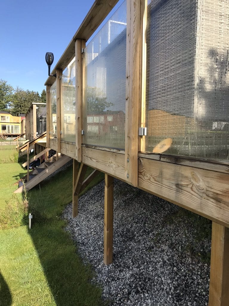Möchten Sie einen besseren Windschutz für ein Holzgeländer haben, ist es oftmals möglich, vorhandene Andreaskreuze zu belassen und die Scheiben davor oder dahinter zu montieren.